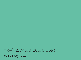 Yxy 42.745,0.266,0.369 Color is a normal green color and the nearest color is Tradewind #5fb3ac. Hex code #65bfa5 and RGB value is rgb(101,191,165). In RGB color space, this color is composed of 40% red, 75% green, 65% blue, In CMYK color space, this color is composed of 47% cyan, 0% magenta, 14% yellow , 25% black , In HSL color space, this color has a hue angle of 163° , 41% saturation and 57% lightness.