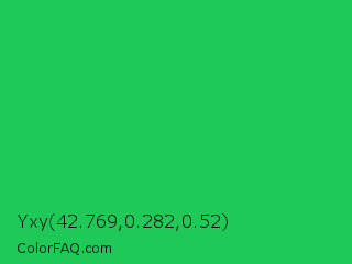 Yxy 42.769,0.282,0.52 Color is a normal green color and the nearest color is Malachite #0bda51. Hex code #1ec958 and RGB value is rgb(30,201,88). In RGB color space, this color is composed of 12% red, 79% green, 35% blue, In CMYK color space, this color is composed of 85% cyan, 0% magenta, 56% yellow , 21% black , In HSL color space, this color has a hue angle of 140° , 74% saturation and 45% lightness.
