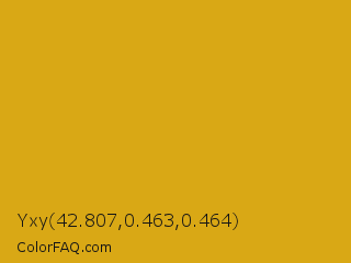 Yxy 42.807,0.463,0.464 Color is a normal orange color and the nearest color is Golden Grass #daa520. Hex code #d9a815 and RGB value is rgb(217,168,21). In RGB color space, this color is composed of 85% red, 66% green, 8% blue, In CMYK color space, this color is composed of 0% cyan, 23% magenta, 90% yellow , 15% black , In HSL color space, this color has a hue angle of 45° , 82% saturation and 47% lightness.