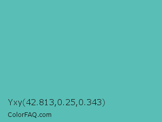 Yxy 42.813,0.25,0.343 Color is a normal cyan color and the nearest color is Fountain Blue #56b4be. Hex code #59bfb6 and RGB value is rgb(89,191,182). In RGB color space, this color is composed of 35% red, 75% green, 71% blue, In CMYK color space, this color is composed of 53% cyan, 0% magenta, 5% yellow , 25% black , In HSL color space, this color has a hue angle of 175° , 44% saturation and 55% lightness.