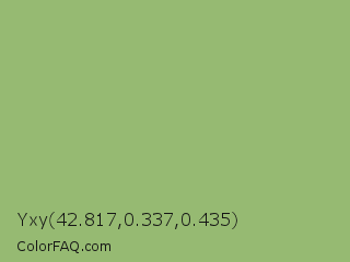 Yxy 42.817,0.337,0.435 Color is a normal green color and the nearest color is Olivine #9ab973. Hex code #96ba72 and RGB value is rgb(150,186,114). In RGB color space, this color is composed of 59% red, 73% green, 45% blue, In CMYK color space, this color is composed of 19% cyan, 0% magenta, 39% yellow , 27% black , In HSL color space, this color has a hue angle of 90° , 34% saturation and 59% lightness.