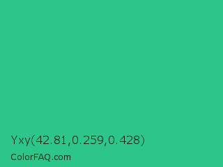 Yxy 42.81,0.259,0.428 Color is a normal green color and the nearest color is Mountain Meadow #30ba8f. Hex code #2cc68b and RGB value is rgb(44,198,139). In RGB color space, this color is composed of 17% red, 78% green, 55% blue, In CMYK color space, this color is composed of 78% cyan, 0% magenta, 30% yellow , 22% black , In HSL color space, this color has a hue angle of 157° , 64% saturation and 47% lightness.