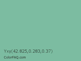 Yxy 42.825,0.283,0.37 Color is a light green color and the nearest color is Acapulco #7cb0a1. Hex code #7cbca1 and RGB value is rgb(124,188,161). In RGB color space, this color is composed of 49% red, 74% green, 63% blue, In CMYK color space, this color is composed of 34% cyan, 0% magenta, 14% yellow , 26% black , In HSL color space, this color has a hue angle of 155° , 32% saturation and 61% lightness.