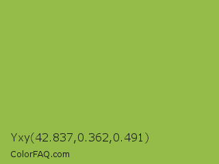 Yxy 42.837,0.362,0.491 Color is a normal green color and the nearest color is Android Green #a4c639. Hex code #95bc49 and RGB value is rgb(149,188,73). In RGB color space, this color is composed of 58% red, 74% green, 29% blue, In CMYK color space, this color is composed of 21% cyan, 0% magenta, 61% yellow , 26% black , In HSL color space, this color has a hue angle of 80° , 46% saturation and 51% lightness.