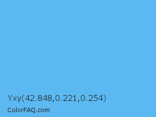 Yxy 42.848,0.221,0.254 Color is a light blue color and the nearest color is Blue Jeans #5dadec. Hex code #5cb8f0 and RGB value is rgb(92,184,240). In RGB color space, this color is composed of 36% red, 72% green, 94% blue, In CMYK color space, this color is composed of 62% cyan, 23% magenta, 0% yellow , 6% black , In HSL color space, this color has a hue angle of 203° , 83% saturation and 65% lightness.