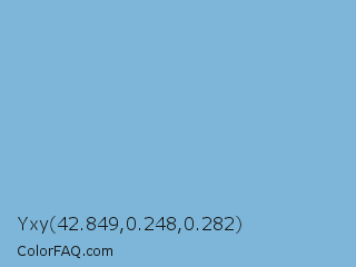 Yxy 42.849,0.248,0.282 Color is a light blue color and the nearest color is Aero #7cb9e8. Hex code #7db6d8 and RGB value is rgb(125,182,216). In RGB color space, this color is composed of 49% red, 71% green, 85% blue, In CMYK color space, this color is composed of 42% cyan, 16% magenta, 0% yellow , 15% black , In HSL color space, this color has a hue angle of 202° , 54% saturation and 67% lightness.