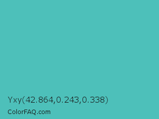 Yxy 42.864,0.243,0.338 Color is a normal cyan color and the nearest color is Fountain Blue #56b4be. Hex code #4dc0ba and RGB value is rgb(77,192,186). In RGB color space, this color is composed of 30% red, 75% green, 73% blue, In CMYK color space, this color is composed of 60% cyan, 0% magenta, 3% yellow , 25% black , In HSL color space, this color has a hue angle of 177° , 48% saturation and 53% lightness.