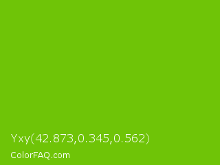 Yxy 42.873,0.345,0.562 Color is a normal green color and the nearest color is Lima #76bd17. Hex code #6fc407 and RGB value is rgb(111,196,7). In RGB color space, this color is composed of 44% red, 77% green, 3% blue, In CMYK color space, this color is composed of 43% cyan, 0% magenta, 96% yellow , 23% black , In HSL color space, this color has a hue angle of 87° , 93% saturation and 40% lightness.