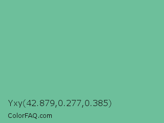 Yxy 42.879,0.277,0.385 Color is a normal green color and the nearest color is Silver Tree #66b58f. Hex code #6dbf9b and RGB value is rgb(109,191,155). In RGB color space, this color is composed of 43% red, 75% green, 61% blue, In CMYK color space, this color is composed of 43% cyan, 0% magenta, 19% yellow , 25% black , In HSL color space, this color has a hue angle of 154° , 39% saturation and 59% lightness.