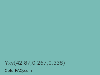 Yxy 42.87,0.267,0.338 Color is a normal cyan color and the nearest color is Neptune #7cb7bb. Hex code #78bbb5 and RGB value is rgb(120,187,181). In RGB color space, this color is composed of 47% red, 73% green, 71% blue, In CMYK color space, this color is composed of 36% cyan, 0% magenta, 3% yellow , 27% black , In HSL color space, this color has a hue angle of 175° , 33% saturation and 60% lightness.