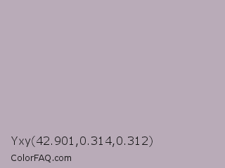Yxy 42.901,0.314,0.312 Color is a light magenta color and the nearest color is Black Shadows #bfafb2. Hex code #b9abb8 and RGB value is rgb(185,171,184). In RGB color space, this color is composed of 73% red, 67% green, 72% blue, In CMYK color space, this color is composed of 0% cyan, 8% magenta, 1% yellow , 27% black , In HSL color space, this color has a hue angle of 304° , 9% saturation and 70% lightness.
