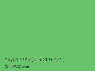 Yxy 42.954,0.304,0.471 Color is a normal green color and the nearest color is Fern #63b76c. Hex code #67c36a and RGB value is rgb(103,195,106). In RGB color space, this color is composed of 40% red, 76% green, 42% blue, In CMYK color space, this color is composed of 47% cyan, 0% magenta, 46% yellow , 24% black , In HSL color space, this color has a hue angle of 122° , 43% saturation and 58% lightness.