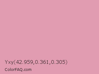 Yxy 42.959,0.361,0.305 Color is a light rose color and the nearest color is Light Thulian Pink #e68fac. Hex code #e19cb1 and RGB value is rgb(225,156,177). In RGB color space, this color is composed of 88% red, 61% green, 69% blue, In CMYK color space, this color is composed of 0% cyan, 31% magenta, 21% yellow , 12% black , In HSL color space, this color has a hue angle of 342° , 53% saturation and 75% lightness.