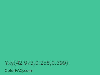 Yxy 42.973,0.258,0.399 Color is a normal green color and the nearest color is Ocean Green #48bf91. Hex code #43c499 and RGB value is rgb(67,196,153). In RGB color space, this color is composed of 26% red, 77% green, 60% blue, In CMYK color space, this color is composed of 66% cyan, 0% magenta, 22% yellow , 23% black , In HSL color space, this color has a hue angle of 160° , 52% saturation and 52% lightness.