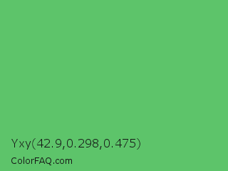 Yxy 42.9,0.298,0.475 Color is a normal green color and the nearest color is Fern #63b76c. Hex code #5dc46a and RGB value is rgb(93,196,106). In RGB color space, this color is composed of 36% red, 77% green, 42% blue, In CMYK color space, this color is composed of 53% cyan, 0% magenta, 46% yellow , 23% black , In HSL color space, this color has a hue angle of 128° , 47% saturation and 57% lightness.