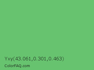 Yxy 43.061,0.301,0.463 Color is a normal green color and the nearest color is Fern #63b76c. Hex code #67c36f and RGB value is rgb(103,195,111). In RGB color space, this color is composed of 40% red, 76% green, 44% blue, In CMYK color space, this color is composed of 47% cyan, 0% magenta, 43% yellow , 24% black , In HSL color space, this color has a hue angle of 125° , 43% saturation and 58% lightness.