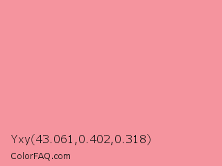 Yxy 43.061,0.402,0.318 Color is a light red color and the nearest color is Sea Pink #ed989e. Hex code #f5949e and RGB value is rgb(245,148,158). In RGB color space, this color is composed of 96% red, 58% green, 62% blue, In CMYK color space, this color is composed of 0% cyan, 40% magenta, 36% yellow , 4% black , In HSL color space, this color has a hue angle of 354° , 83% saturation and 77% lightness.