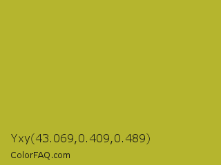 Yxy 43.069,0.409,0.489 Color is a normal yellow color and the nearest color is Acid Green #b0bf1a. Hex code #b5b52e and RGB value is rgb(181,181,46). In RGB color space, this color is composed of 71% red, 71% green, 18% blue, In CMYK color space, this color is composed of 0% cyan, 0% magenta, 75% yellow , 29% black , In HSL color space, this color has a hue angle of 60° , 59% saturation and 45% lightness.