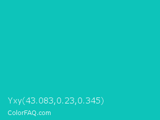 Yxy 43.083,0.23,0.345 Color is a normal cyan color and the nearest color is Tiffany Blue #0abab5. Hex code #0dc4ba and RGB value is rgb(13,196,186). In RGB color space, this color is composed of 5% red, 77% green, 73% blue, In CMYK color space, this color is composed of 93% cyan, 0% magenta, 5% yellow , 23% black , In HSL color space, this color has a hue angle of 177° , 88% saturation and 41% lightness.