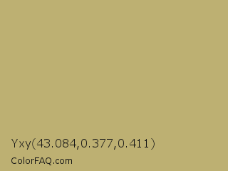 Yxy 43.084,0.377,0.411 Color is a normal yellow color and the nearest color is Misty Moss #bbb477. Hex code #bdb072 and RGB value is rgb(189,176,114). In RGB color space, this color is composed of 74% red, 69% green, 45% blue, In CMYK color space, this color is composed of 0% cyan, 7% magenta, 40% yellow , 26% black , In HSL color space, this color has a hue angle of 50° , 36% saturation and 59% lightness.