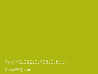 Yxy 43.092,0.406,0.511 Color is a normal yellow color and the nearest color is La Rioja #b3c110. Hex code #acb810 and RGB value is rgb(172,184,16). In RGB color space, this color is composed of 67% red, 72% green, 6% blue, In CMYK color space, this color is composed of 7% cyan, 0% magenta, 91% yellow , 28% black , In HSL color space, this color has a hue angle of 64° , 84% saturation and 39% lightness.