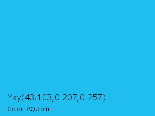 Yxy 43.103,0.207,0.257 Color is a normal blue color and the nearest color is Spiro Disco Ball #0fc0fc. Hex code #20bdf1 and RGB value is rgb(32,189,241). In RGB color space, this color is composed of 13% red, 74% green, 95% blue, In CMYK color space, this color is composed of 87% cyan, 22% magenta, 0% yellow , 5% black , In HSL color space, this color has a hue angle of 195° , 88% saturation and 54% lightness.