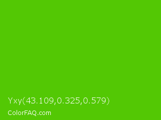 Yxy 43.109,0.325,0.579 Color is a normal green color and the nearest color is Harlequin Green #46cb18. Hex code #53c804 and RGB value is rgb(83,200,4). In RGB color space, this color is composed of 33% red, 78% green, 2% blue, In CMYK color space, this color is composed of 59% cyan, 0% magenta, 98% yellow , 22% black , In HSL color space, this color has a hue angle of 96° , 96% saturation and 40% lightness.