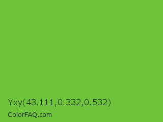 Yxy 43.111,0.332,0.532 Color is a normal green color and the nearest color is Green RYB #66b032. Hex code #6dc43b and RGB value is rgb(109,196,59). In RGB color space, this color is composed of 43% red, 77% green, 23% blue, In CMYK color space, this color is composed of 44% cyan, 0% magenta, 70% yellow , 23% black , In HSL color space, this color has a hue angle of 98° , 54% saturation and 50% lightness.