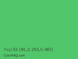 Yxy 43.181,0.293,0.483 Color is a normal green color and the nearest color is Emerald #50c878. Hex code #52c668 and RGB value is rgb(82,198,104). In RGB color space, this color is composed of 32% red, 78% green, 41% blue, In CMYK color space, this color is composed of 59% cyan, 0% magenta, 47% yellow , 22% black , In HSL color space, this color has a hue angle of 131° , 50% saturation and 55% lightness.