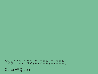 Yxy 43.192,0.286,0.386 Color is a light green color and the nearest color is Acapulco #7cb0a1. Hex code #79be99 and RGB value is rgb(121,190,153). In RGB color space, this color is composed of 47% red, 75% green, 60% blue, In CMYK color space, this color is composed of 36% cyan, 0% magenta, 19% yellow , 25% black , In HSL color space, this color has a hue angle of 148° , 35% saturation and 61% lightness.