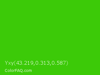Yxy 43.219,0.313,0.587 Color is a normal green color and the nearest color is Harlequin Green #46cb18. Hex code #3cca08 and RGB value is rgb(60,202,8). In RGB color space, this color is composed of 24% red, 79% green, 3% blue, In CMYK color space, this color is composed of 70% cyan, 0% magenta, 96% yellow , 21% black , In HSL color space, this color has a hue angle of 104° , 92% saturation and 41% lightness.