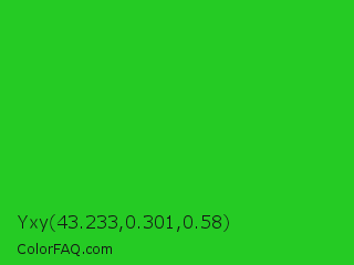 Yxy 43.233,0.301,0.58 Color is a normal green color and the nearest color is Lime Green #32cd32. Hex code #25cb24 and RGB value is rgb(37,203,36). In RGB color space, this color is composed of 15% red, 80% green, 14% blue, In CMYK color space, this color is composed of 82% cyan, 0% magenta, 82% yellow , 20% black , In HSL color space, this color has a hue angle of 120° , 70% saturation and 47% lightness.