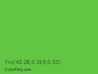 Yxy 43.28,0.319,0.53 Color is a normal green color and the nearest color is Green RYB #66b032. Hex code #60c643 and RGB value is rgb(96,198,67). In RGB color space, this color is composed of 38% red, 78% green, 26% blue, In CMYK color space, this color is composed of 52% cyan, 0% magenta, 66% yellow , 22% black , In HSL color space, this color has a hue angle of 107° , 53% saturation and 52% lightness.