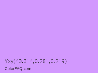 Yxy 43.314,0.281,0.219 Color is a light purple color and the nearest color is Pale Violet #cc99ff. Hex code #d298fe and RGB value is rgb(210,152,254). In RGB color space, this color is composed of 82% red, 60% green, 100% blue, In CMYK color space, this color is composed of 17% cyan, 40% magenta, 0% yellow , 0% black , In HSL color space, this color has a hue angle of 274° , 98% saturation and 80% lightness.