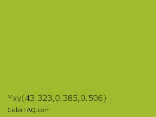 Yxy 43.323,0.385,0.506 Color is a normal lime color and the nearest color is Android Green #a4c639. Hex code #a1bb2f and RGB value is rgb(161,187,47). In RGB color space, this color is composed of 63% red, 73% green, 18% blue, In CMYK color space, this color is composed of 14% cyan, 0% magenta, 75% yellow , 27% black , In HSL color space, this color has a hue angle of 71° , 60% saturation and 46% lightness.