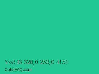 Yxy 43.328,0.253,0.415 Color is a normal green color and the nearest color is Shamrock #33cc99. Hex code #23c793 and RGB value is rgb(35,199,147). In RGB color space, this color is composed of 14% red, 78% green, 58% blue, In CMYK color space, this color is composed of 82% cyan, 0% magenta, 26% yellow , 22% black , In HSL color space, this color has a hue angle of 161° , 70% saturation and 46% lightness.