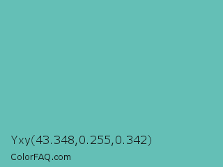 Yxy 43.348,0.255,0.342 Color is a normal cyan color and the nearest color is Tradewind #5fb3ac. Hex code #64bfb6 and RGB value is rgb(100,191,182). In RGB color space, this color is composed of 39% red, 75% green, 71% blue, In CMYK color space, this color is composed of 48% cyan, 0% magenta, 5% yellow , 25% black , In HSL color space, this color has a hue angle of 174° , 42% saturation and 57% lightness.