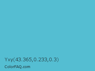 Yxy 43.365,0.233,0.3 Color is a normal cyan color and the nearest color is Sea Serpent #4bc7cf. Hex code #54bed2 and RGB value is rgb(84,190,210). In RGB color space, this color is composed of 33% red, 75% green, 82% blue, In CMYK color space, this color is composed of 60% cyan, 10% magenta, 0% yellow , 18% black , In HSL color space, this color has a hue angle of 190° , 58% saturation and 58% lightness.