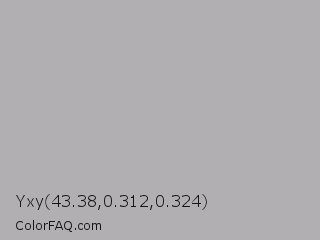 Yxy 43.38,0.312,0.324 Color is a light purple color and the nearest color is Nobel #b7b1b1. Hex code #b2afb3 and RGB value is rgb(178,175,179). In RGB color space, this color is composed of 70% red, 69% green, 70% blue, In CMYK color space, this color is composed of 1% cyan, 2% magenta, 0% yellow , 30% black , In HSL color space, this color has a hue angle of 285° , 3% saturation and 69% lightness.