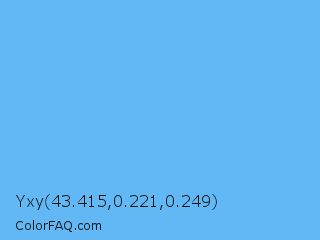Yxy 43.415,0.221,0.249 Color is a light blue color and the nearest color is Blue Jeans #5dadec. Hex code #61b8f5 and RGB value is rgb(97,184,245). In RGB color space, this color is composed of 38% red, 72% green, 96% blue, In CMYK color space, this color is composed of 60% cyan, 25% magenta, 0% yellow , 4% black , In HSL color space, this color has a hue angle of 205° , 88% saturation and 67% lightness.