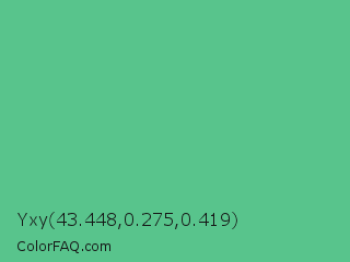 Yxy 43.448,0.275,0.419 Color is a normal green color and the nearest color is Ocean Green #48bf91. Hex code #58c48c and RGB value is rgb(88,196,140). In RGB color space, this color is composed of 35% red, 77% green, 55% blue, In CMYK color space, this color is composed of 55% cyan, 0% magenta, 29% yellow , 23% black , In HSL color space, this color has a hue angle of 149° , 48% saturation and 56% lightness.