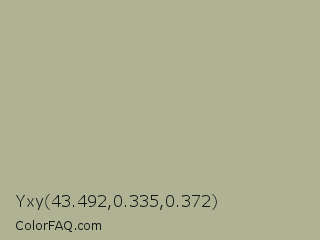 Yxy 43.492,0.335,0.372 Color is a light yellow color and the nearest color is Taupe Gray #b3af95. Hex code #afb394 and RGB value is rgb(175,179,148). In RGB color space, this color is composed of 69% red, 70% green, 58% blue, In CMYK color space, this color is composed of 2% cyan, 0% magenta, 17% yellow , 30% black , In HSL color space, this color has a hue angle of 68° , 17% saturation and 64% lightness.