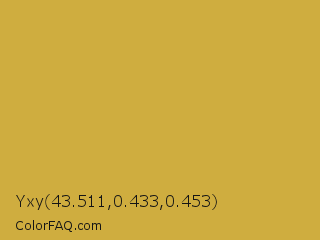 Yxy 43.511,0.433,0.453 Color is a normal yellow color and the nearest color is Old Gold #cfb53b. Hex code #cfad3f and RGB value is rgb(207,173,63). In RGB color space, this color is composed of 81% red, 68% green, 25% blue, In CMYK color space, this color is composed of 0% cyan, 16% magenta, 70% yellow , 19% black , In HSL color space, this color has a hue angle of 46° , 60% saturation and 53% lightness.