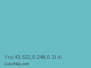 Yxy 43.522,0.248,0.314 Color is a normal cyan color and the nearest color is Downy #6fd0c5. Hex code #69bdc7 and RGB value is rgb(105,189,199). In RGB color space, this color is composed of 41% red, 74% green, 78% blue, In CMYK color space, this color is composed of 47% cyan, 5% magenta, 0% yellow , 22% black , In HSL color space, this color has a hue angle of 186° , 46% saturation and 60% lightness.