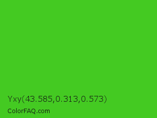 Yxy 43.585,0.313,0.573 Color is a normal green color and the nearest color is Harlequin Green #46cb18. Hex code #44ca22 and RGB value is rgb(68,202,34). In RGB color space, this color is composed of 27% red, 79% green, 13% blue, In CMYK color space, this color is composed of 66% cyan, 0% magenta, 83% yellow , 21% black , In HSL color space, this color has a hue angle of 108° , 71% saturation and 46% lightness.