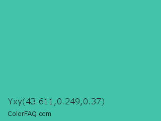 Yxy 43.611,0.249,0.37 Color is a normal cyan color and the nearest color is Puerto Rico #3fc1aa. Hex code #43c4aa and RGB value is rgb(67,196,170). In RGB color space, this color is composed of 26% red, 77% green, 67% blue, In CMYK color space, this color is composed of 66% cyan, 0% magenta, 13% yellow , 23% black , In HSL color space, this color has a hue angle of 168° , 52% saturation and 52% lightness.