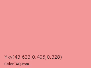 Yxy 43.633,0.406,0.328 Color is a light red color and the nearest color is Sea Pink #ed989e. Hex code #f49798 and RGB value is rgb(244,151,152). In RGB color space, this color is composed of 96% red, 59% green, 60% blue, In CMYK color space, this color is composed of 0% cyan, 38% magenta, 38% yellow , 4% black , In HSL color space, this color has a hue angle of 359° , 81% saturation and 77% lightness.