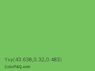 Yxy 43.638,0.32,0.483 Color is a normal green color and the nearest color is Mantis #74c365. Hex code #75c35f and RGB value is rgb(117,195,95). In RGB color space, this color is composed of 46% red, 76% green, 37% blue, In CMYK color space, this color is composed of 40% cyan, 0% magenta, 51% yellow , 24% black , In HSL color space, this color has a hue angle of 107° , 45% saturation and 57% lightness.