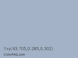 Yxy 43.705,0.285,0.302 Color is a light blue color and the nearest color is Cadet Blue #a9b2c3. Hex code #a3b2c6 and RGB value is rgb(163,178,198). In RGB color space, this color is composed of 64% red, 70% green, 78% blue, In CMYK color space, this color is composed of 18% cyan, 10% magenta, 0% yellow , 22% black , In HSL color space, this color has a hue angle of 214° , 23% saturation and 71% lightness.