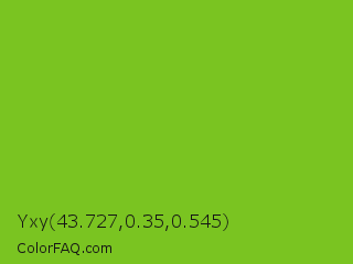 Yxy 43.727,0.35,0.545 Color is a normal green color and the nearest color is Lima #76bd17. Hex code #7ac421 and RGB value is rgb(122,196,33). In RGB color space, this color is composed of 48% red, 77% green, 13% blue, In CMYK color space, this color is composed of 38% cyan, 0% magenta, 83% yellow , 23% black , In HSL color space, this color has a hue angle of 87° , 71% saturation and 45% lightness.